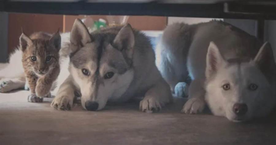 因為猞猁帶回家時還很小,于是主人就把牠交給了家裡幾隻狗。